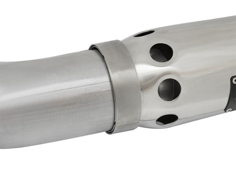 aFe LARGE BORE HD exhaust systems are constructed from mandrel-bent stainless steel tubing for maximum flow. Smooth transition bends allow for low turbulence, increasing horsepower and torque, while decreasing EGT. The 2-piece design and bayonet style hangers provide stability and for an easy installation. Finishing off the exhaust is a polished, stainless steel slash cut tip with intercooling vents designed to reduce exhaust gas temperatures at the tailpipe. A unique stainless steel laser-cut aFe Power logo plate is riveted on for an aggressive style.