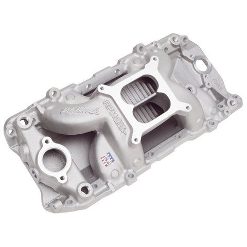 Edelbrock part #7561 RPM Air-Gap 2-O intake manifold is designed for street 396-502 c.i.d. Chevy V8's with large oval-port cylinder heads (1975 and earlier) or Edelbrock Performer/Performer RPM heads. This RPM Air-Gap incorporates the same race-winning technology that's been used on our Victor Series competition intakes for decades. The Air-Gap design features an open air space that separates the runners from the hot engine oil resulting in a cooler, denser charge for more power. Includes rear water outlets, two distributor clamp locations and nitrous bosses. Accepts all late model alternator and A/C brackets for the street. For square bore carburetors only. Will not fit under stock hood of Corvette, 1964-67 Chevelle or 1967-81 Camaro. No provision for exhaust heated chokes and no exhaust crossover.