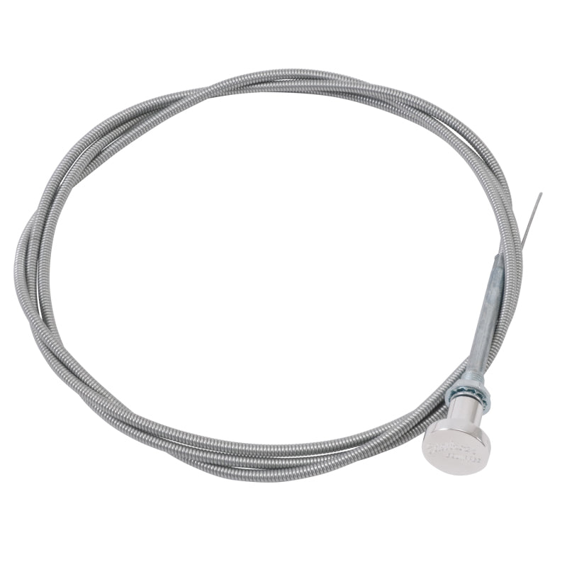 This universal push/pull cable is intended for use with Edelbrock 2 and 4 barrel carburetors equipped with a manual choke. It features a polished knob that has been engraved with the 'Edelbrock Equipped' logo. It has an overall length of 6' and is intended to be routed from the dash, through the firewall, to the customer's carburetor.