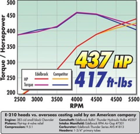 The Edelbrock #5087 E-210 Cylinder heads are designed for use with 1955-1986 Small-Block Chevy applications. The Edelbrock E-Series cylinder heads are a step up in affordable performance from our E-Street line. They feature larger runners for increased airflow, revised exhaust ports and larger diameter springs for higher lift camshafts, making them ideal for a spec series racer and larger displacement engines. The Edelbrock #5027 E-Series Cylinder heads also have as-cast ports and maintain the stock exhaust port location, making them compatible with OEM headers and hardware.