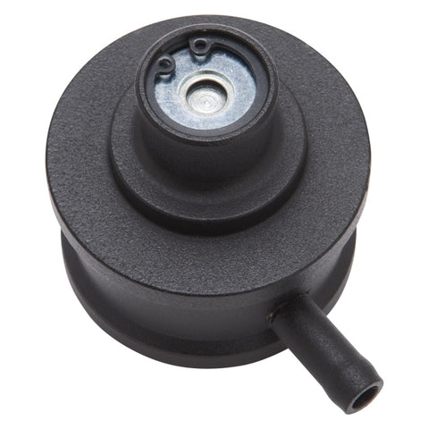 Edelbrock part #4406 Billet Aluminum Breather with 90 deg. PCV port which looks like a traditional breather for standard 1.250" valve cover holes. The breather housing has an internal PCV with a 90 deg. port to attach a hose. This breather is round and is 2.50" at the base with a slight cone shape. Overall height is 2.49". Features a Black powder coated finish