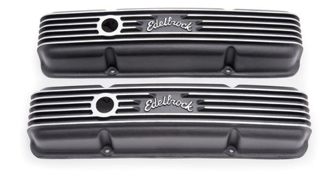 Edelbrock part #41433 Classic Series Valve Covers are designed for Chevy 262-400 V8 1959-86 (with breather holes) applications and have a Black powder coat finish. Edelbrock first made these aluminum valve covers in the late '50s and they're still a classic. Made of heavy-gauge sand-cast aluminum, Overall height is measured from base to top at the highest point. Edelbrock classic valve covers can be machined to accept breathers if desired.