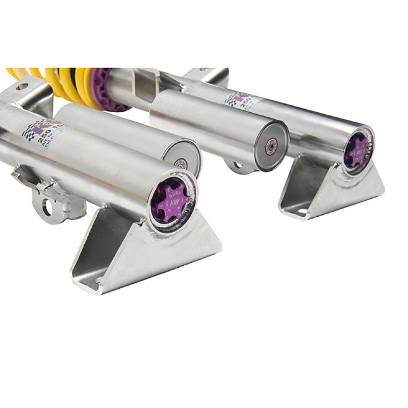 Cutting-edge motorsports technology for more performance on the road. Like every suspension product developed by KW automotive, the suspension manufacturer, and manufactured in Germany, the KW V3 Coilover suspension kit also provides a significant plus in safety reserves in road traffic. Thanks to the chassis with its high-quality dampers, springs, and elastomer spring elements, pitching and rolling movements during load changes such as evasive maneuvers, cornering, acceleration, and braking are significantly reduced. The braking distances are also shortened. Thanks to improved support and feedback, drivers not only feel safer but driving in everyday life becomes even safer. With compression and rebound stage damping, that can be set separately and independently of each other, the damper setup can be customized to your personal driving preferences or vehicle changes such as weight, tire characteristics, or altered vehicle rigidity. True performance optimization is only possible with this unique, patented system. For example, this allows the compression damping force to be increased and get more grip from the tires, to improve cornering behavior and reduce squat without simultaneously altering the rebound stage damping which is optimally matched to the spring rate, a scenario which results in reduced grip and the associated loss of performance. The KW V3 coilover kit is the ideal tool for performance-oriented drivers and experienced tuning enthusiasts who place a strong emphasis on the overall performance of their suspension. The Variant 3 features patented TVR-A and TVC-A technology that provides separately adjustable rebound and compression damping. The extensive adjustment range of the independently configurable rebound and compression make it easy to directly influence the steering behavior, directional stability, grip and handling characteristics for confident and repeatable results at the limit of driving dynamics.